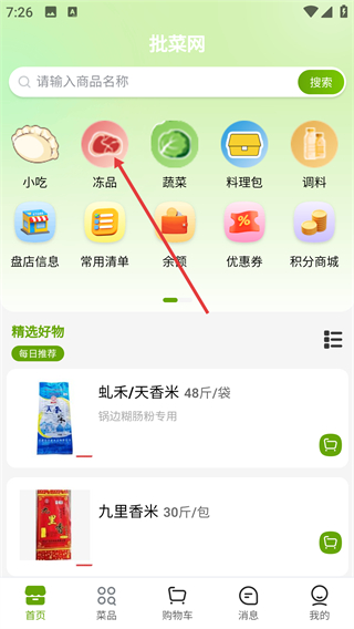 1、进入批菜网首页,点击【冻品】分类图标,可切换至对应商品板块。