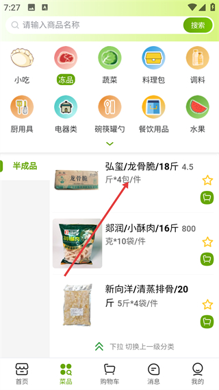 2、进入【冻品】分类后,在半成品板块找到【弘玺/龙骨脆/18斤-4.5斤*4包/件】,可查看同分类下的其他冻品商品。