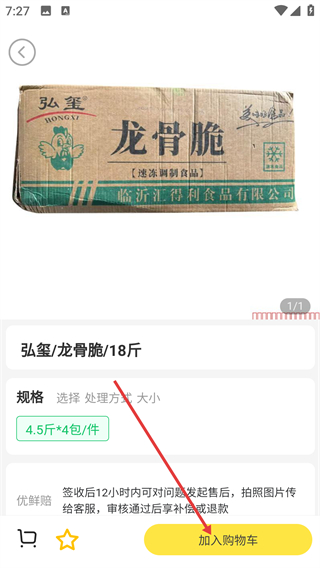 3、进入【弘玺/龙骨脆/18斤】详情页,确认【4.5斤*4包/件】规格后,点击【加入购物车】,可享受优鲜赔售后保障。