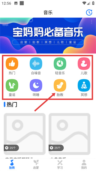 1、进入音乐页面,该页面涵盖启蒙、胎教等音乐类型分类,点击【胎教】分类按钮,进入胎教音乐的选择页面。