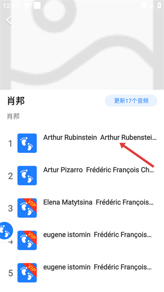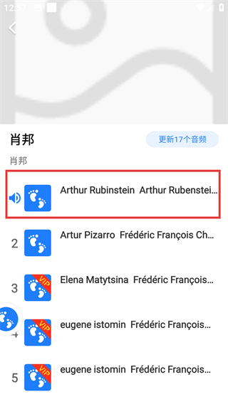 3、进入肖邦的音频列表页面,可查看其名下的多个胎教音频资源,选择目标音频。