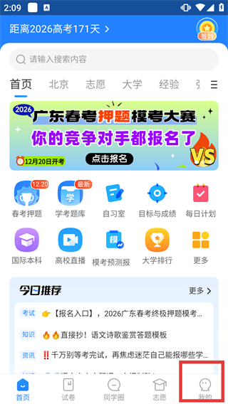 1、在高考直通车首页,点击底部导航栏的【我的】按钮,进入个人中心页面。