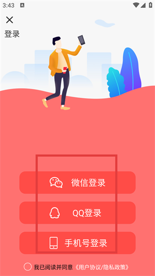4、若需使用相关功能,勾选同意协议后选择【微信登录】【QQ登录】或【手机号登录】完成账号登录。
