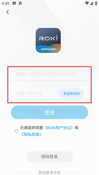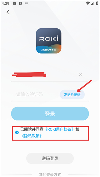3、在登录页面中,先勾选【已阅读并同意《ROKI用户协议》和《隐私政策》】,再点击【发送验证码】获取验证信息。