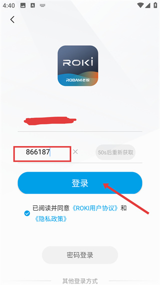 2、进入ROKi登录页面后,该页面支持新号码自动注册,提供验证码登录方式,需在对应输入框填写手机号。