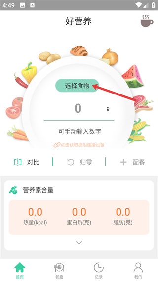 1、进入【好营养】界面,先点击【选择食物】按钮,可手动输入数字。