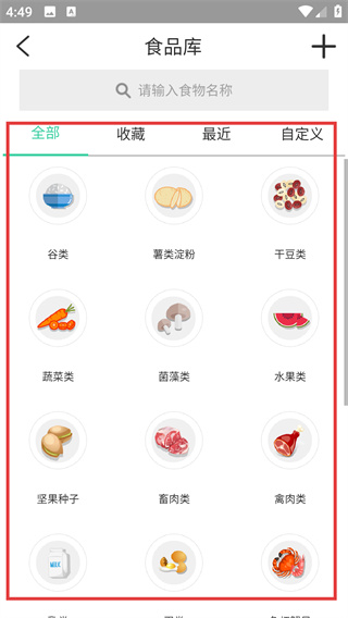 2、打开【食品库】,可在搜索框输入食物名称,也能按【谷类】、【薯类淀粉】、【干豆类】等分类查找食物。