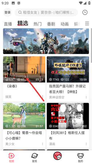 1、进入【精选】页面,浏览展示的各类视频内容,选择目标视频【染春】,点击该视频的封面进入对应的播放页面。