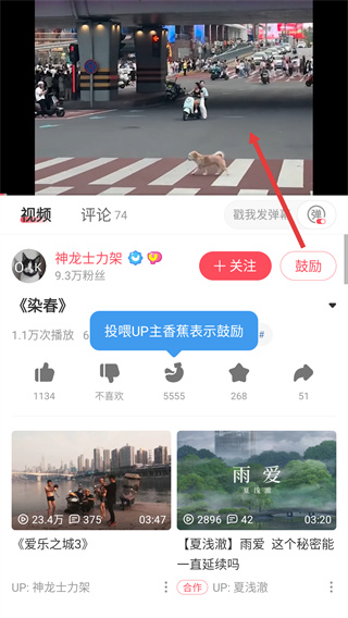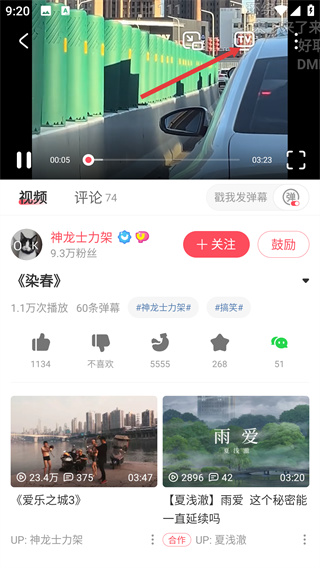 2、进入【染春】的视频播放页,可查看UP主的信息,还能操作【关注】【鼓励】按钮与该UP主进行互动,点击视频触发功能显示。