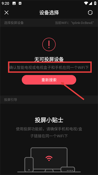 4、进入【设备选择】页面后,确认设备同WiFi后,点击【重新搜索】按钮尝试搜索可用设备,连接设备后即可完成投屏操作。