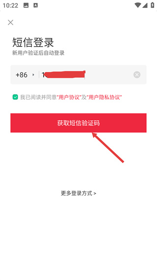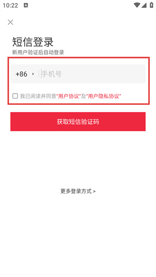 2、在短信登录页面,填写手机号,并勾选“我已阅读并同意”对应的协议选项。