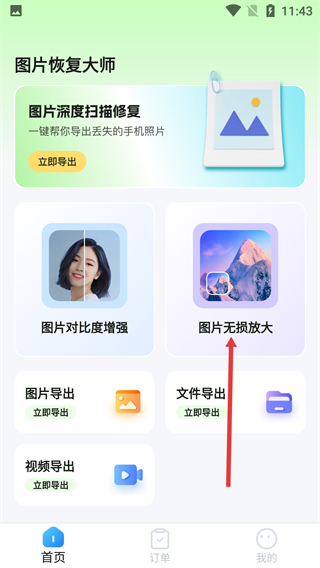 1、进入图片恢复大师首页,查看【图片对比度增强】【图片无损放大】等功能选项,点击【图片无损放大】进入对应功能页面。