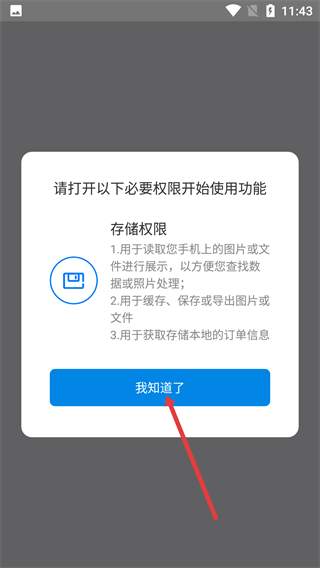 2、弹出存储权限请求弹窗后,了解该权限用于读取、缓存、保存文件等用途,点击【我知道了】开启权限以使用功能。