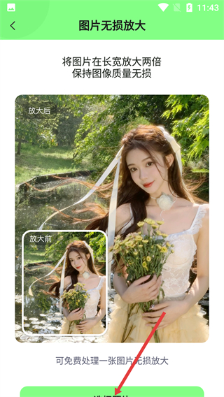 3、在图片无损放大页面,查看图片放大前后的效果对比,点击选择图片,可免费处理一张图片的无损放大操作。