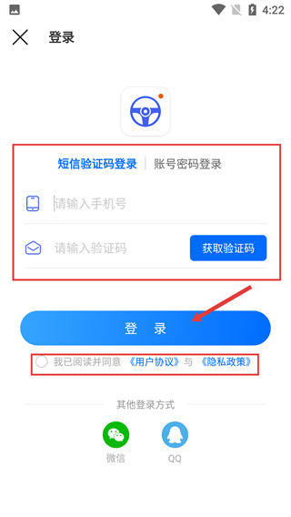 1、进入登录页面,选择【短信验证码登录】方式,填写手机号、获取并输入验证码,勾选【用户协议】与【隐私政策】后点击【登录】完成账号登录。