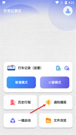 2、进入安驾记录仪主界面,找到【通知播报】功能按钮并点击,进入通知播报的设置页面,可配置行车时的通知播报相关功能。