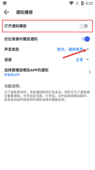 3、在通知播报设置页面,开启播报通知,找到【声音类型】选项,点击该选项可展开语音类型的选择列表。