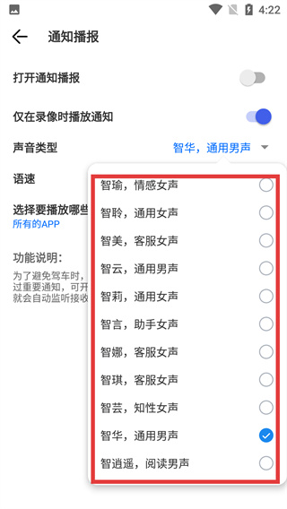 4、在声音类型的选择弹窗中,可选择多种语音类型,选定目标类型后即可更换通知播报的语音。