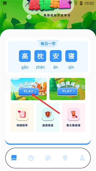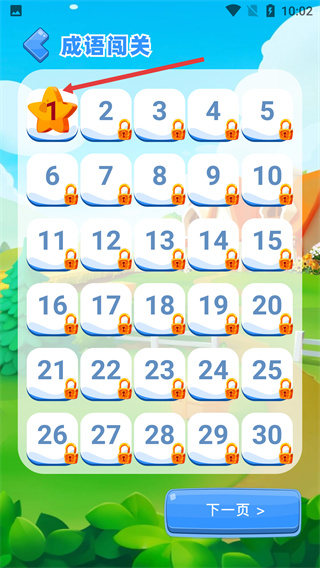 1、在“成语乐园”首页点击【成语闯关】对应的PLAY按钮,进入该游戏的关卡选择页面,可开启成语闯关玩法。