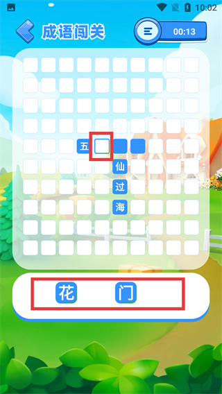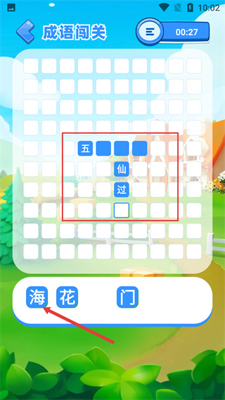 3、在答题界面中,选择下方备选字【海】,将其填入对应空格,完成“八仙过海”这一成语的部分填写步骤。