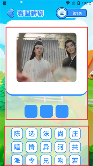 4、在【看图猜剧】第1关答题界面,依据上方图片提示,选择下方备选字填入空格,完成对应的电视剧名猜测。