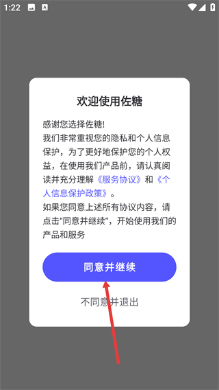1、在【欢迎使用佐糖】的协议页面,点击【同意并继续】按钮,确认《服务协议》等条款后进入应用首页。
