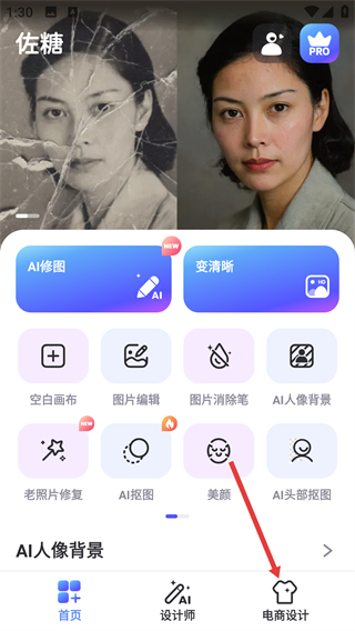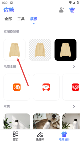 2、进入佐糖首页后,点击底部导航栏的【电商设计】选项,进入含多类模板的电商设计页面。