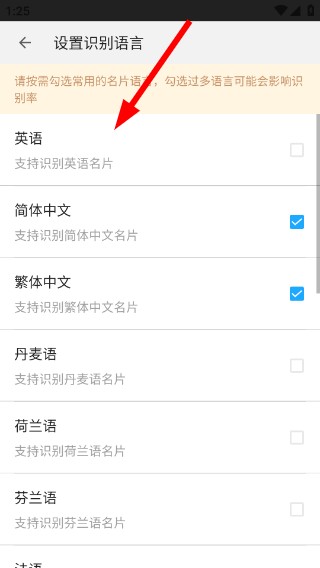 4、进入设置识别语言页面后,可根据需求勾选目标语言,完成名片识别语言的配置,让应用能识别对应语言的名片信息。