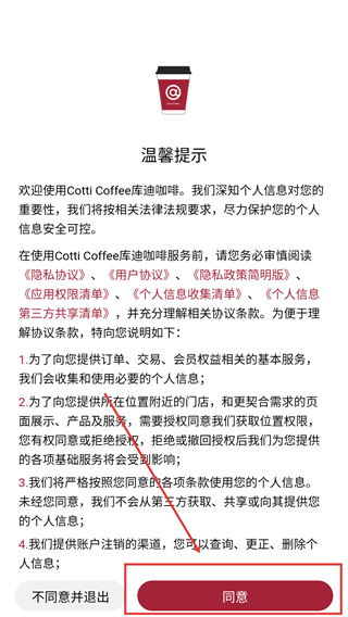 1、首次使用【Cotti-Coffee】,需审慎阅读《隐私协议》《用户协议》等条款,了解信息收集规则后,点击【同意】按钮即可进入软件。