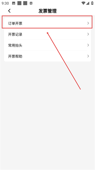 4、进入【发票管理】页面后,点击列表首位的【订单开票】选项,即可发起对应消费订单的发票开具申请流程。