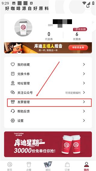 3、在个人中心页面,找到【发票管理】选项,点击该入口即可进入发票相关操作页面。