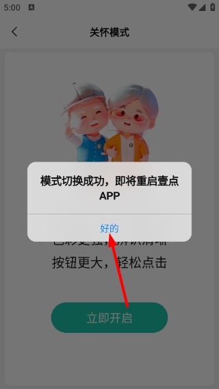 4、在弹出的“模式切换成功”提示框中,点击“好的”按钮,完成设置并重启APP应用关怀模式。