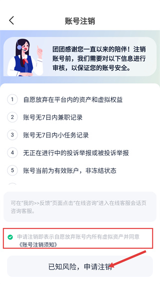 4、在账号注销页面,确认相关审核条件后,勾选协议并点击【已知风险,申请注销】按钮,提交账号注销申请。