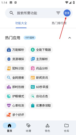 1、在首页【功能大全】板块可查看【15个应用】,点击右上角【登录】按钮,即可进入登录相关操作的菜单页面。
