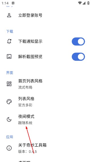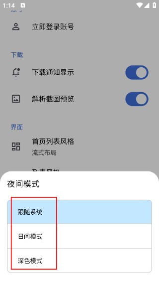 3、进入【设置】页面,可开启/关闭【下载通知显示】-【解析截图预览】,还能调整【首页列表风格】-【夜间模式】等界面选项。