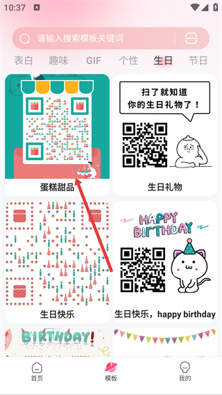 1、在模板页面的“生日”分类下,选择“蛋糕甜品”模板,进入该模板的详情页面。