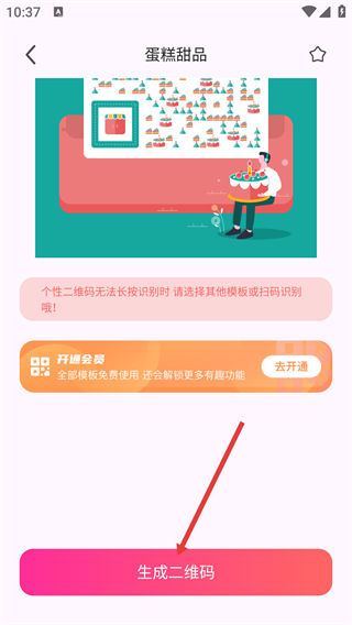 2、在“蛋糕甜品”模板详情页,点击底部【生成二维码】按钮,进入功能选择页面。