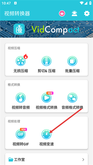 1、在视频转换器主界面的“视频处理”板块,选择【视频变速】功能,进入视频选择页面。