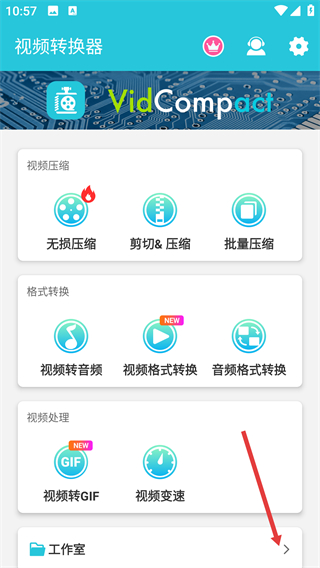 1、在视频转换器主界面,点击底部的【工作室】选项,进入工作室的视频管理页面。