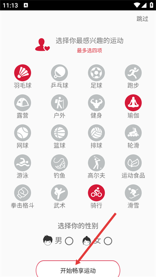 1、在兴趣选择页面,选定感兴趣的运动(最多选四项)并选择性别后,点击【开始畅享运动】按钮,进入应用首页。