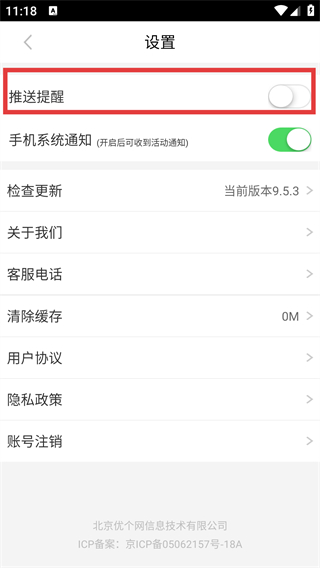 4、在设置页面,找到【推送提醒】开关选项,可通过该开关开启或关闭应用的推送提醒功能。