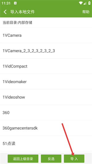 3、在本地文件目录页面,选定目标文件后,点击底部的【导入】按钮,完成文件的导入操作。
