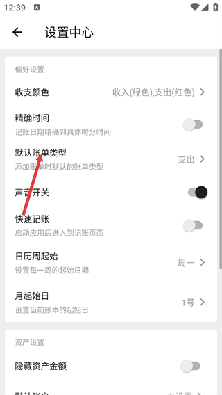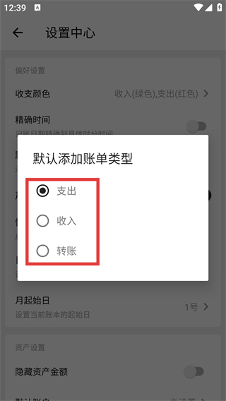 3、在设置中心页面,点击【默认账单类型】选项,弹出“默认添加账单类型”的选择弹窗。