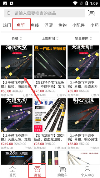 1、进入APP后点底部【商城】,选择【鱼竿】分类,可通过【价格】、【销量排序】筛选,查看【让子弹飞不退不换】类商品。