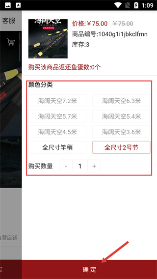 3、在商品选择界面,选定【颜色分类】里的规格,设购买数量后点【确定】。
