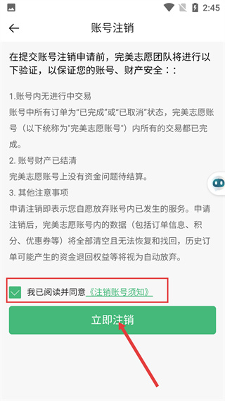 4、在【账号注销】页面,勾选“我已阅读并同意《注销账号须知》”后,点击【立即注销】完成账号注销操作。