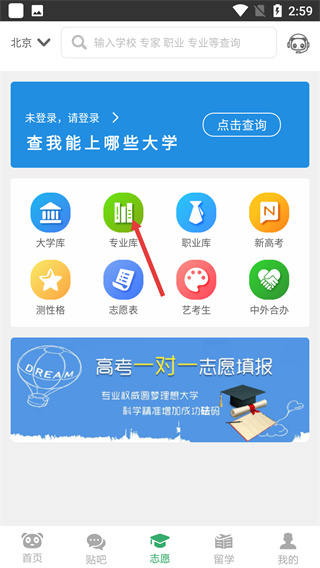 1、进入【志愿】页面,找到并点击【专业库】功能按钮,进入专业分类的查询与选择界面。