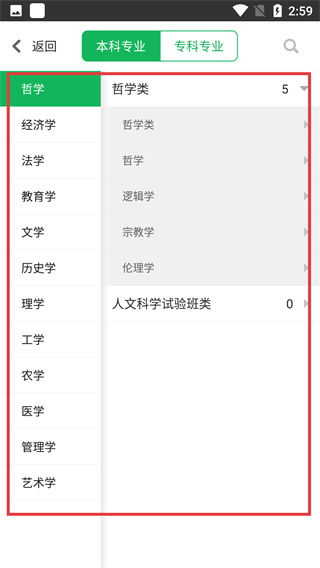 2、进入专业库界面后,可在【本科专业】标签下,选择不同的学科类别,查看对应类别的专业列表。