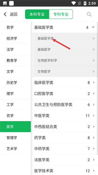 3、在学科类别中选定【医学】,找到并点击【基础医学类】选项,进入该专业类别的详情页面。