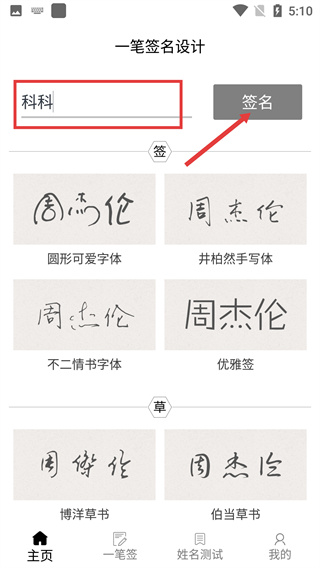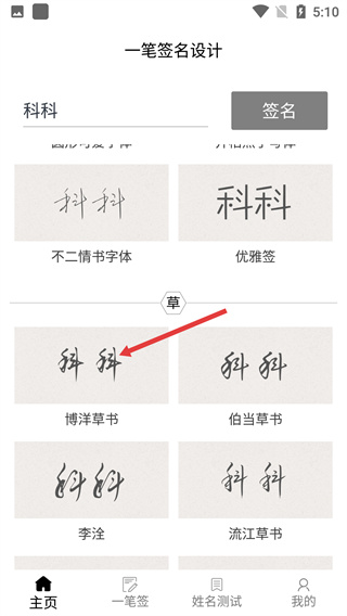 1、进入一笔签名设计页面,在姓名输入框填写【科科】后,点击【签名】按钮,生成对应姓名的多种字体样式。